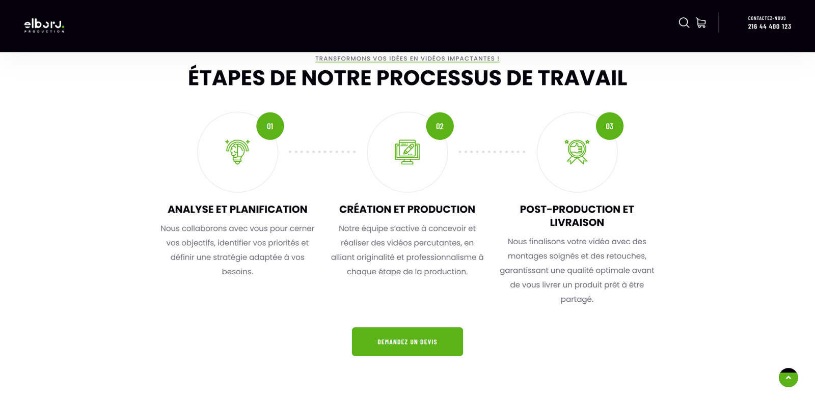 Chaque section a été pensée pour refléter la créativité, le professionnalisme et l’impact visuel de l’entreprise, tout en offrant une expérience utilisateur fluide sur tous les appareils. Cette réalisation illustre notre savoir-faire dans la création de sites web adaptés aux entreprises du secteur audiovisuel et de la production visuelle.